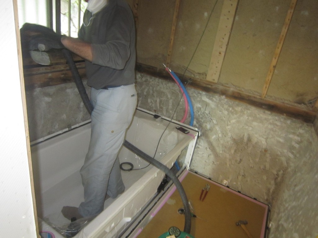 本日はユニットバス据付の工事中です。本日中に工事終了予定ですので明日は大工さんは浴室入口の造作作業を行います。