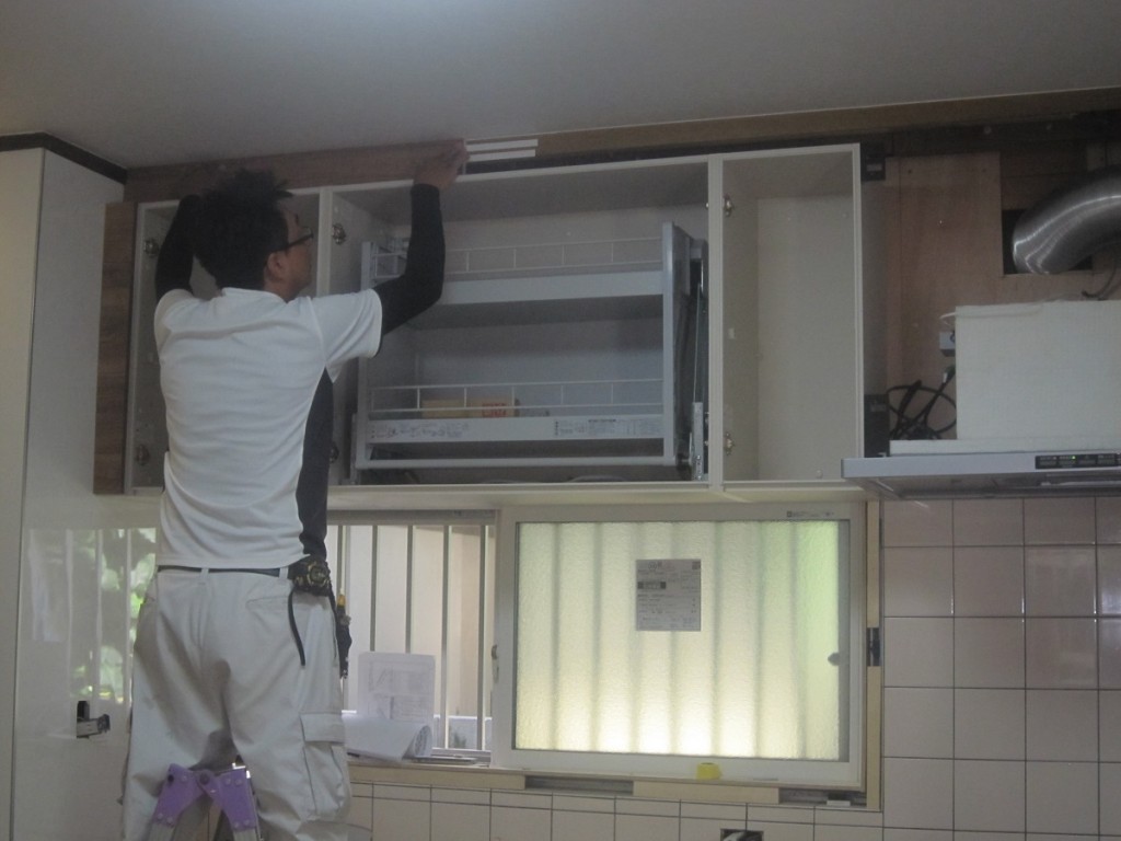 K様邸は本日システムキッチンの据付作業中です。付属棚が多く現在吊戸棚を据付中でキッチン本体設置まで少々時間を要します。