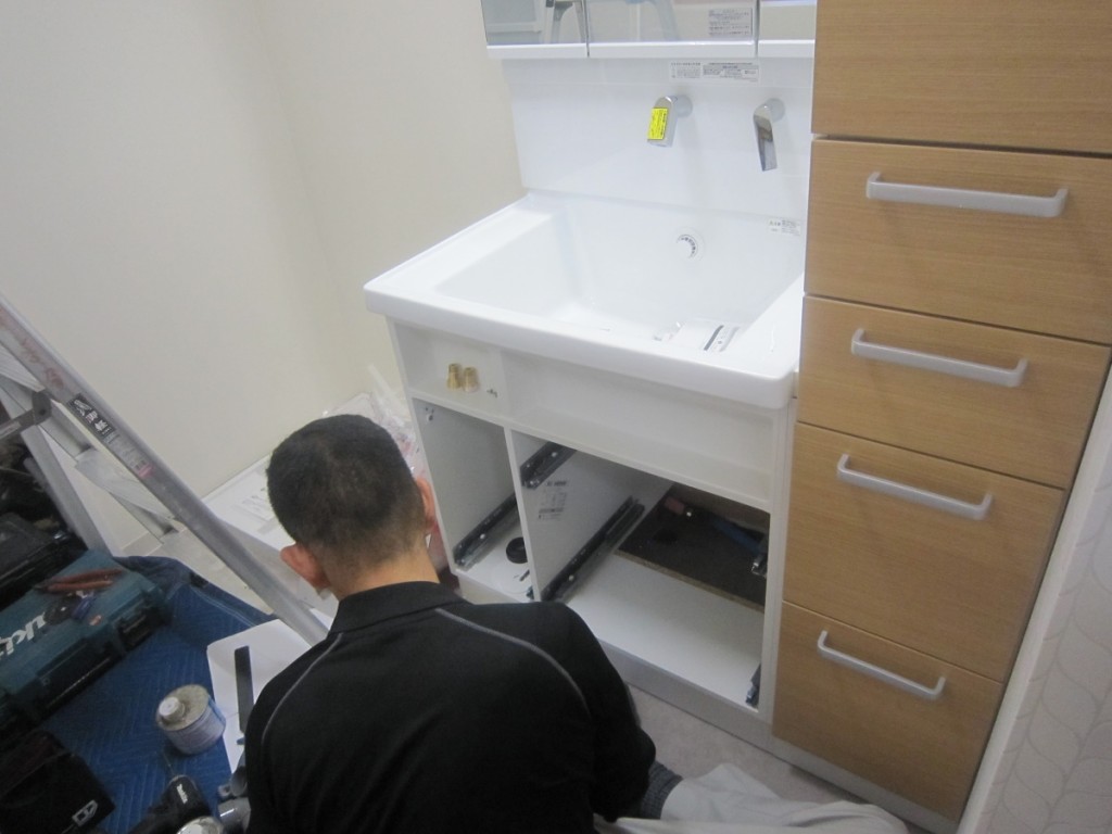 キッチン施工と併行して洗面台の据付と給排水管接続を設備屋さんが作業中です。