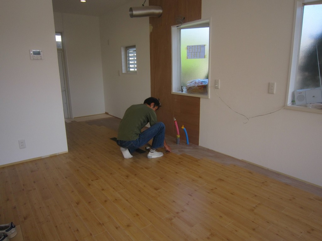 本日はクロス、フロア等の最終作業中です。今回はフロアは床ビニールタイルとして仕上げとなります。