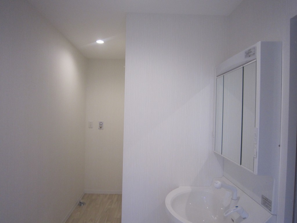 本日は洗面所廻りの機器設置や照明器具取り付けが済みました。正面は洗濯機置き場となります。そこで、照明を付けてみました。