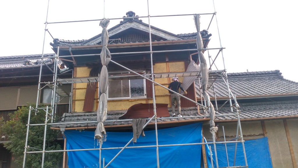 内部の解体作業と併行しまして外部のトタンを撤去作業を行ってます。足場組み立ても出来上がりました。