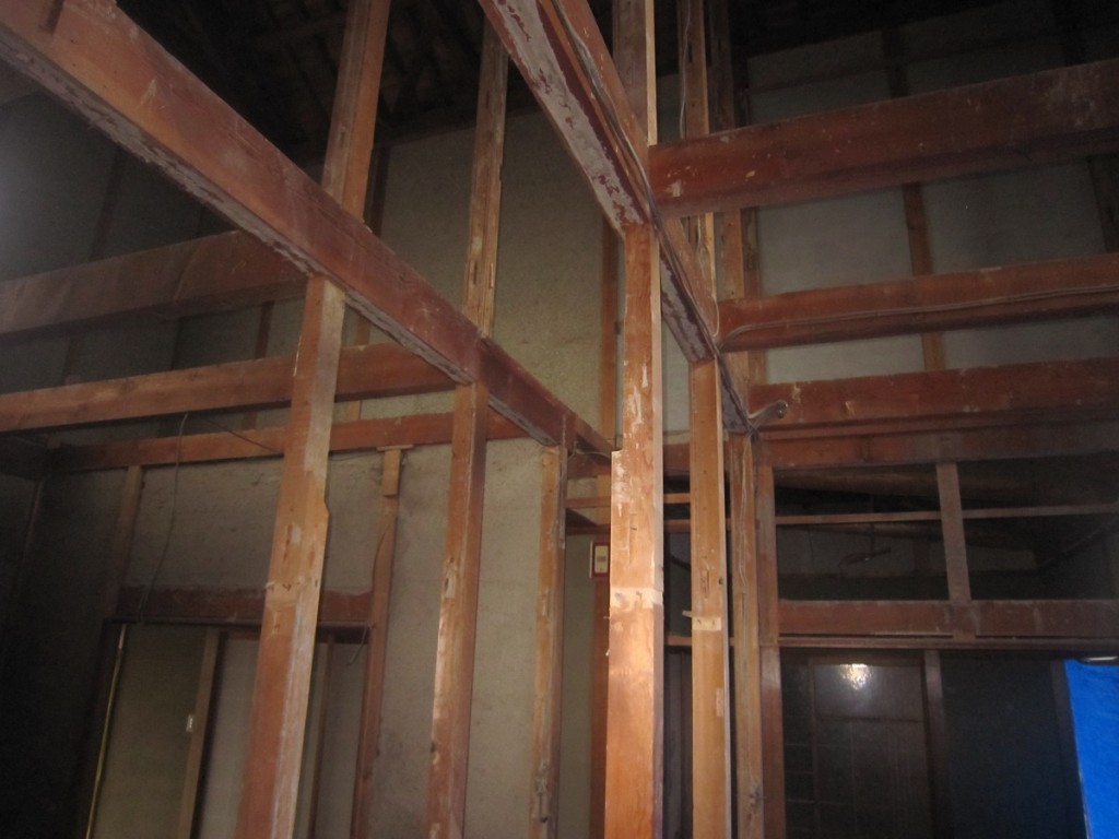 本日は設備業者さんが外部排水管等作業中です。内部の解体作業は天井、壁、床は柱、根太等除き スケルトン状況となってますが、解体工事はまだ一部残ってます。解体が済めば来週から内部の大工さんの造作工事開始となります。
