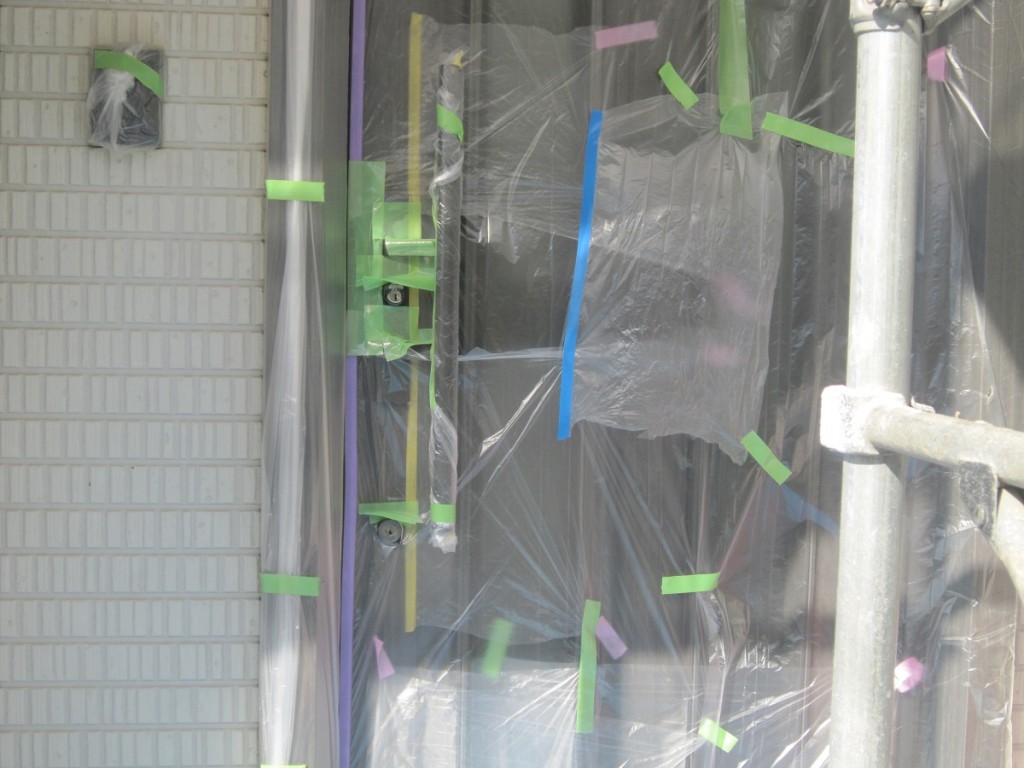 外壁塗装工事に当たり足場設置が終われば外観すべて養生シートでサッシ等に塗装が付着しない様 おおいます。玄関入口まで保護して出入りにご迷惑かけてます。
