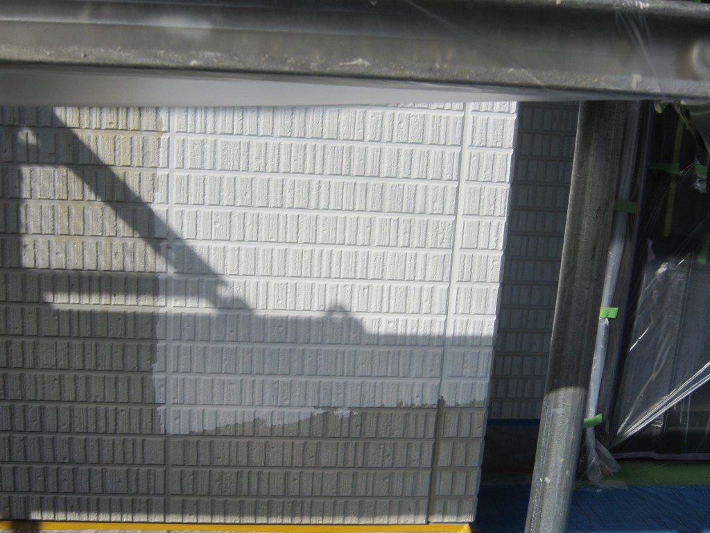 外壁塗装で色決めていただきたく玄関脇の外壁一部にお試し塗装して施主様了解得て塗装に当たります。高圧洗浄済み下塗・中塗りまで終わりまして最終作業の上塗りに移ります。