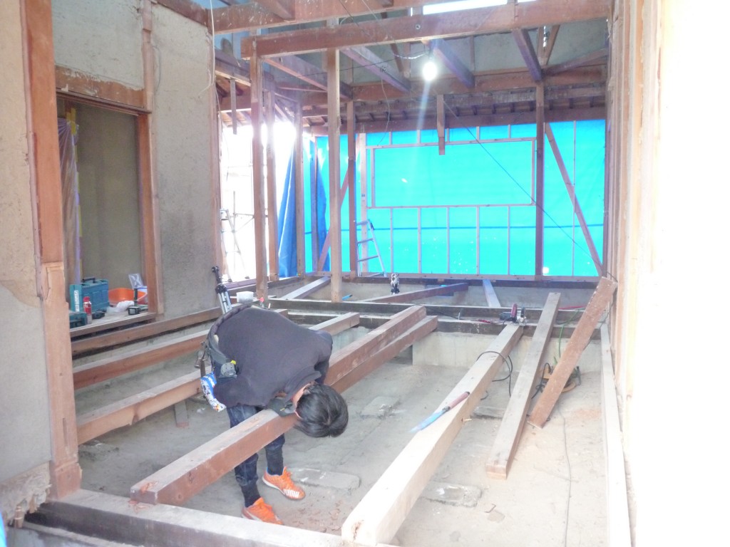 今日は床組(床面を支える為の骨組み)作業をしています。