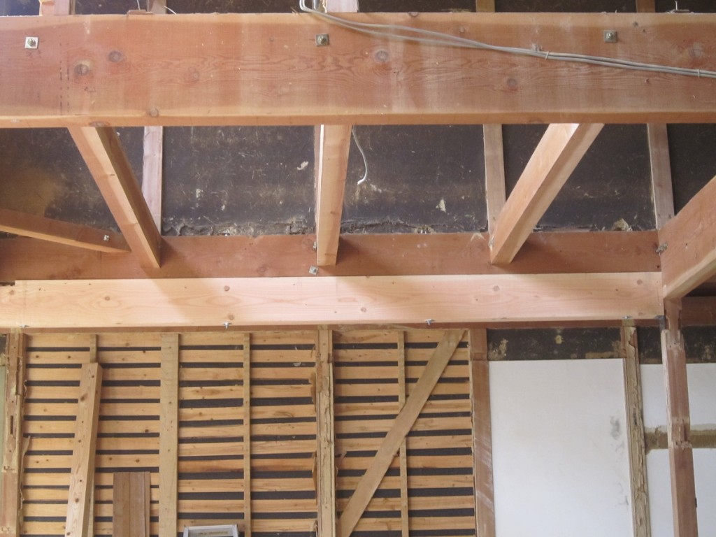 1階西側床の間と仏壇の間にあった床柱を抜くため大きな梁を入れまして補強しました。