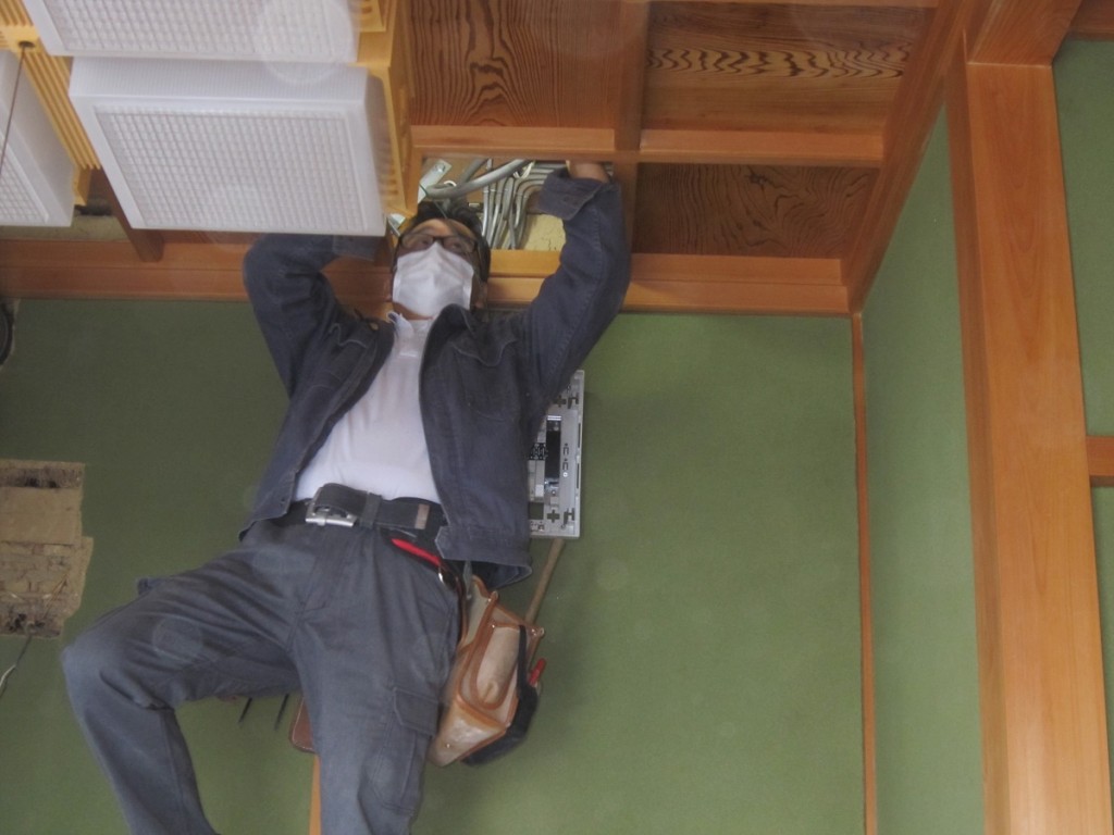 本日は電気屋さん2名でキッチン廻りの電気配線の工事中です。玄関が入ったスペース設置であり 1階天井からの配線であり四苦八苦の作業となりました。