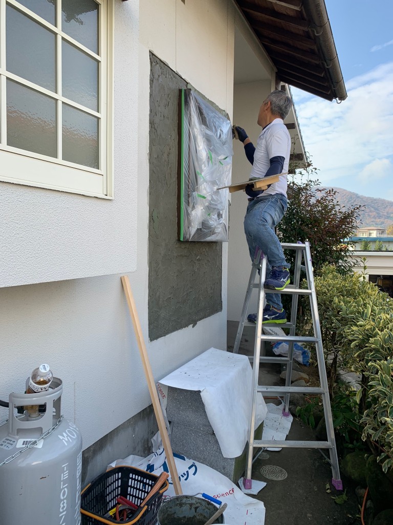 雨も上がり今日は左官屋さんが外壁にモルタルを塗っています。