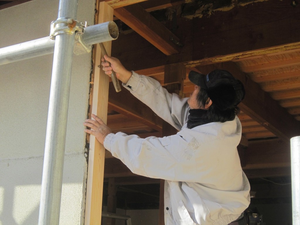 本日、大工作業は1階洋室の掃き出し窓取り付けの為開口枠をつけてます。