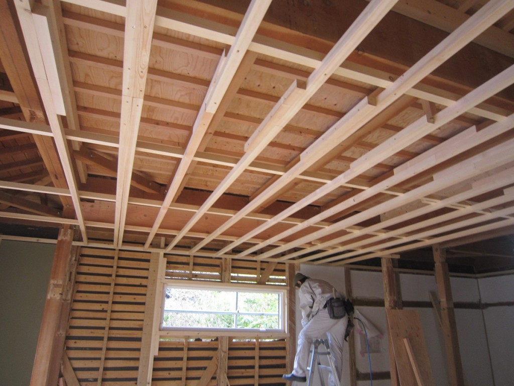 現在、大工さん1名で造作工事に励んで頂いております。1階天井下地がほぼ終了となります。これからは、部屋間仕切りの作業に移ります。