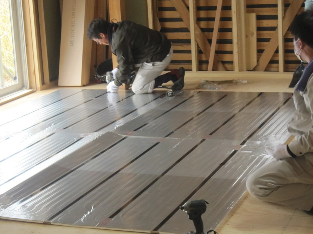 本日のメイン工事は床暖房パネル敷設です。職人3名で作業中でリビングダイニング、脱衣室に敷設しますが工事は本日中に仕上ります。製品はダイキン製ヒートポンプ循環式のタイプとなります。