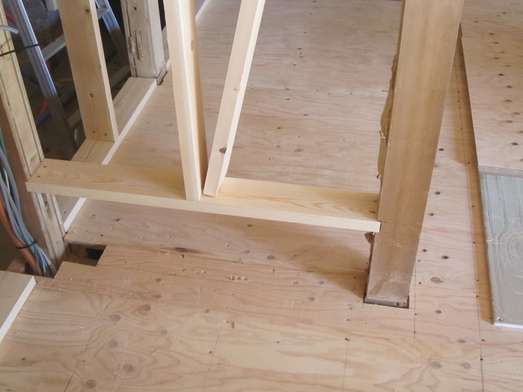 大工さんは本日訪問しますと階段下のスペースを活用して掃除機ルンバの収納基地局造りのため間仕切り下部を切断し出入口としました。