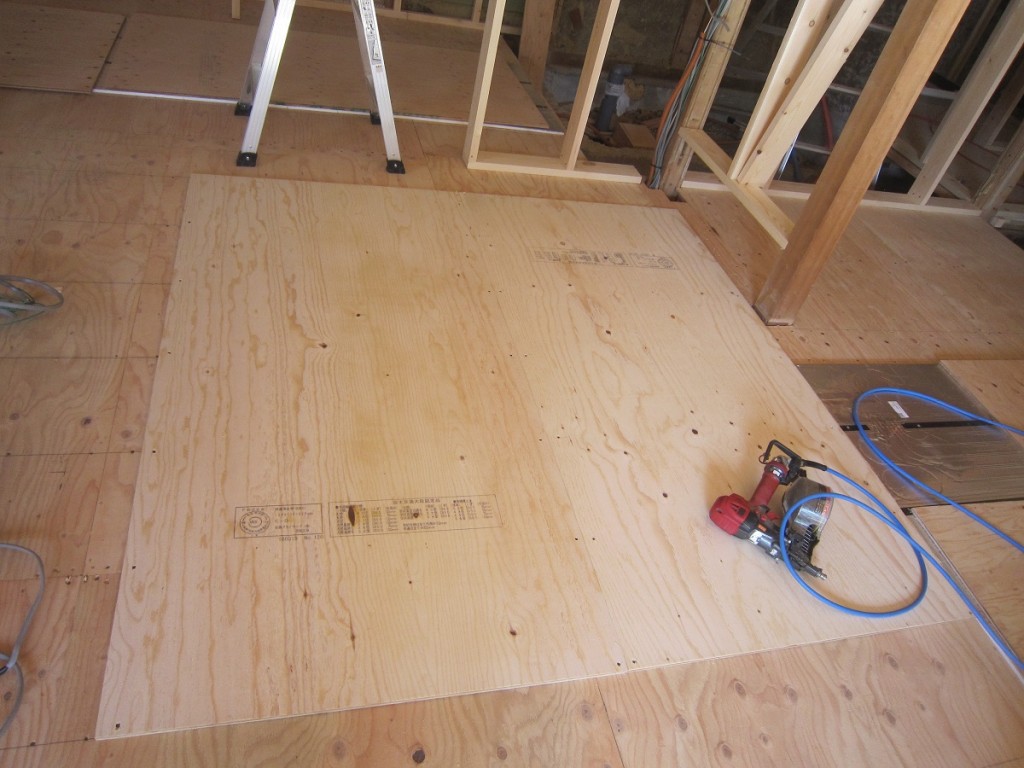 先日載せました様にK様邸は床暖房設置されパネル設営が済みましたが。パネル厚さ12ミリがあり 床下地は2重の合板張りとなります。