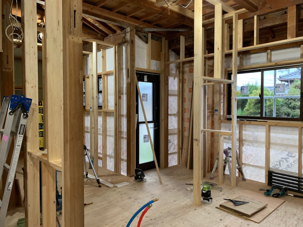 キッチン廻りの造作をしています。カウンターをつけたり、飾り棚をつけたりするため壁をおこしていきます。