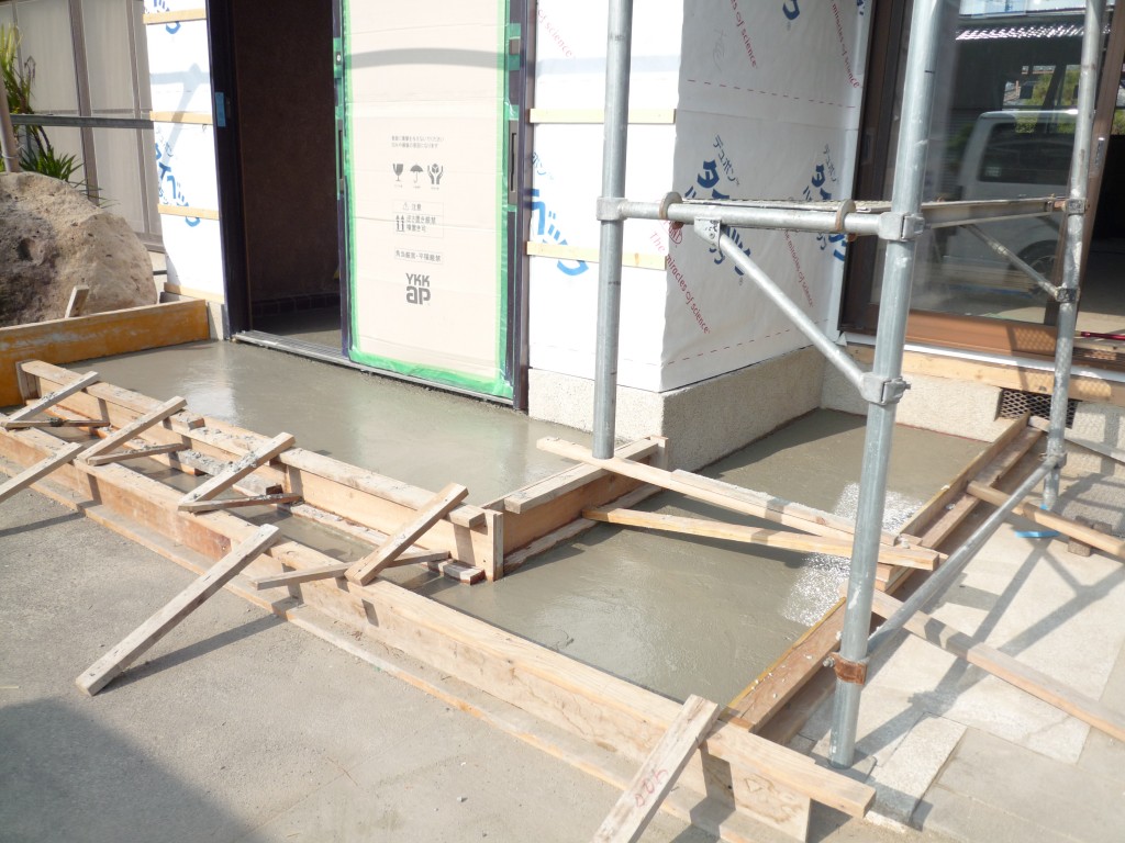 玄関框の高さが高く上がり降りが大変だったということで外のポーチ部分から高さを上げることにしました。型枠をしてモルタルで階段を作りました。仕上げはタイルを貼っていきます。