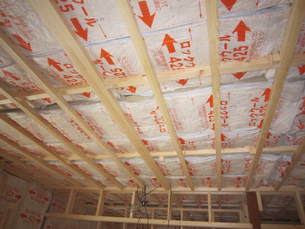 本日も内部造作は2名体制で遅れてました2階天井の100mmロックウール断熱材を入れ終えました。これで1、2階 共に断熱材作業終了です。