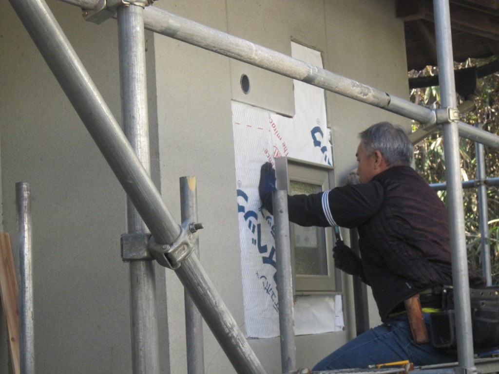 外部モルタル仕上げを行うためサッシ取替等で外部補修箇所を透湿防水シートをはりラス 下地作業中です。