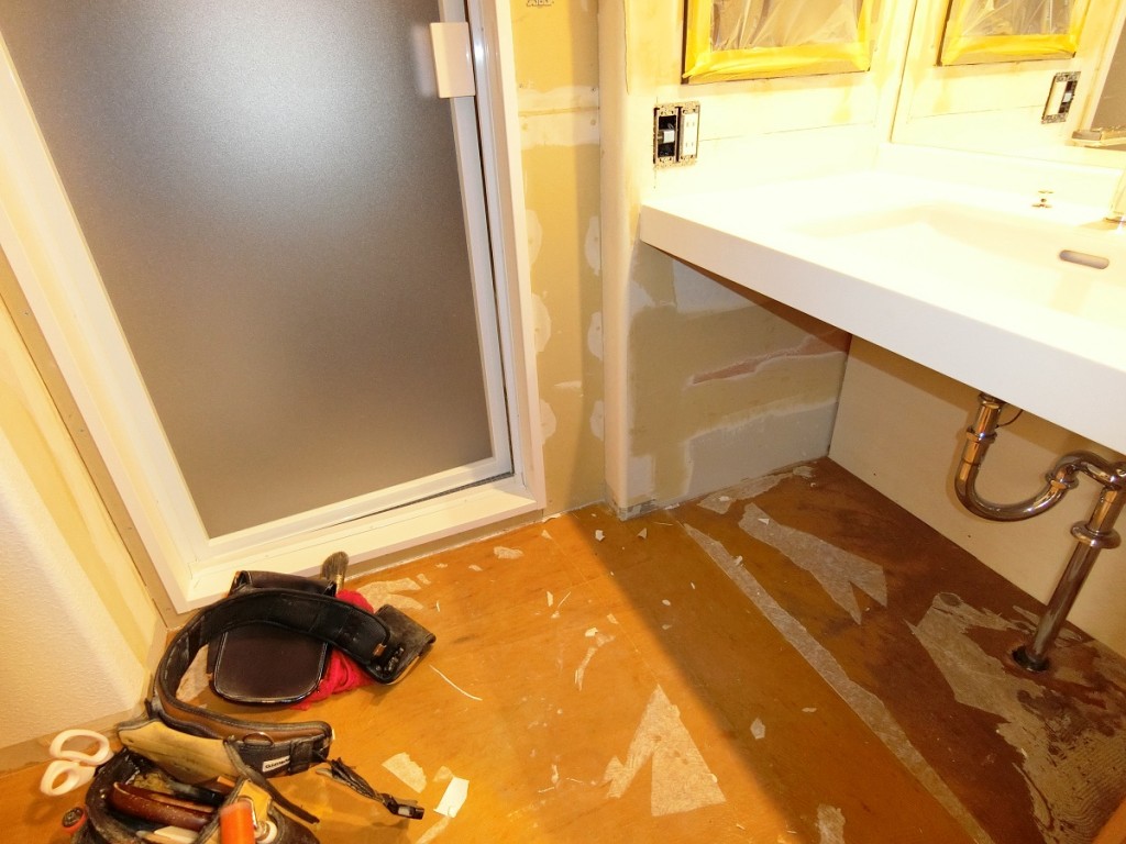 クロス業者さんはクッションフロア、クロス剝がし中です。