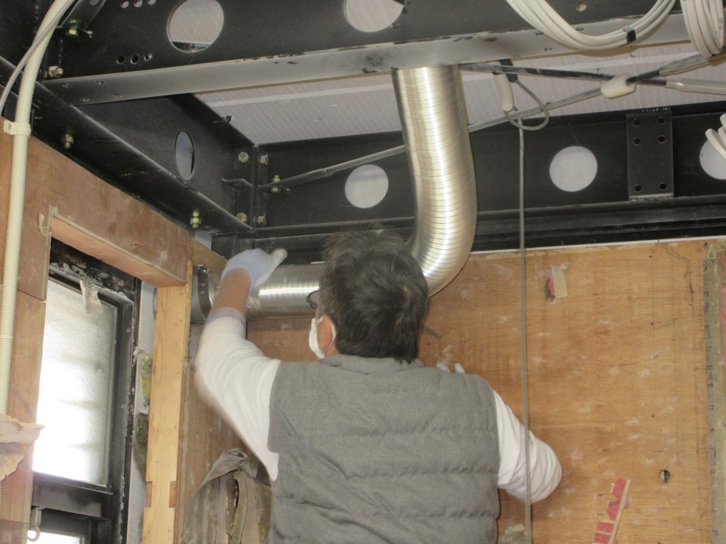 明日のシスバス設置工事に備えまして電気屋さんは換気のジャバラの取り付けに追われてます。