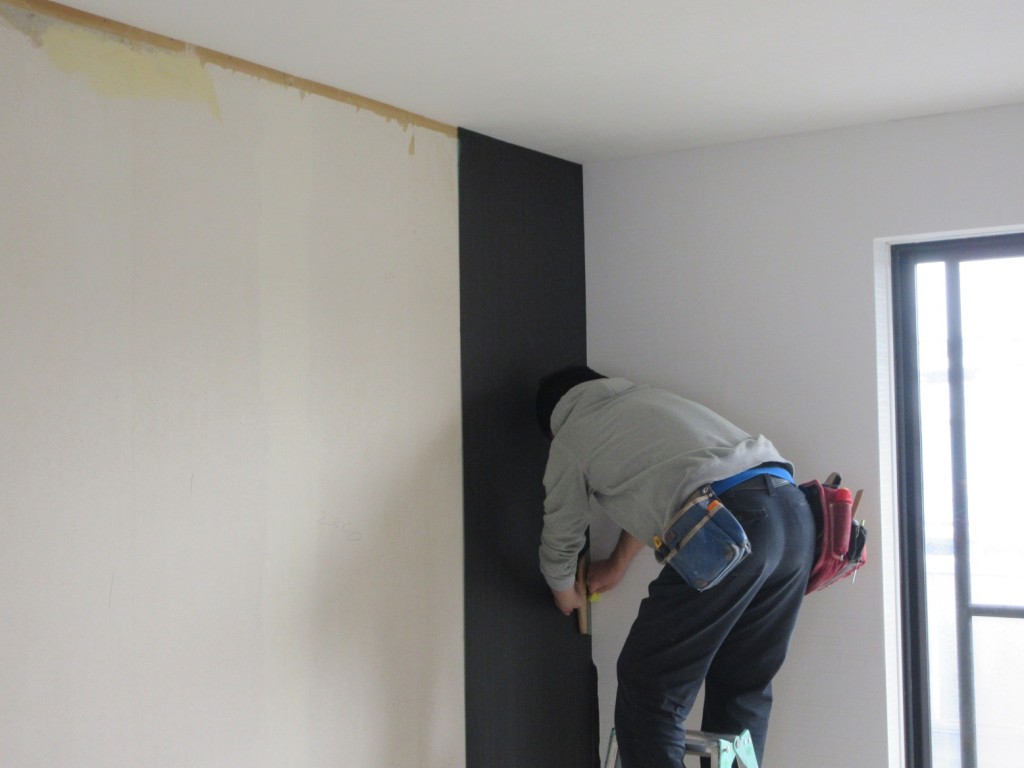 本日はクロス工事の2階天井、内壁に貼る作業中です。