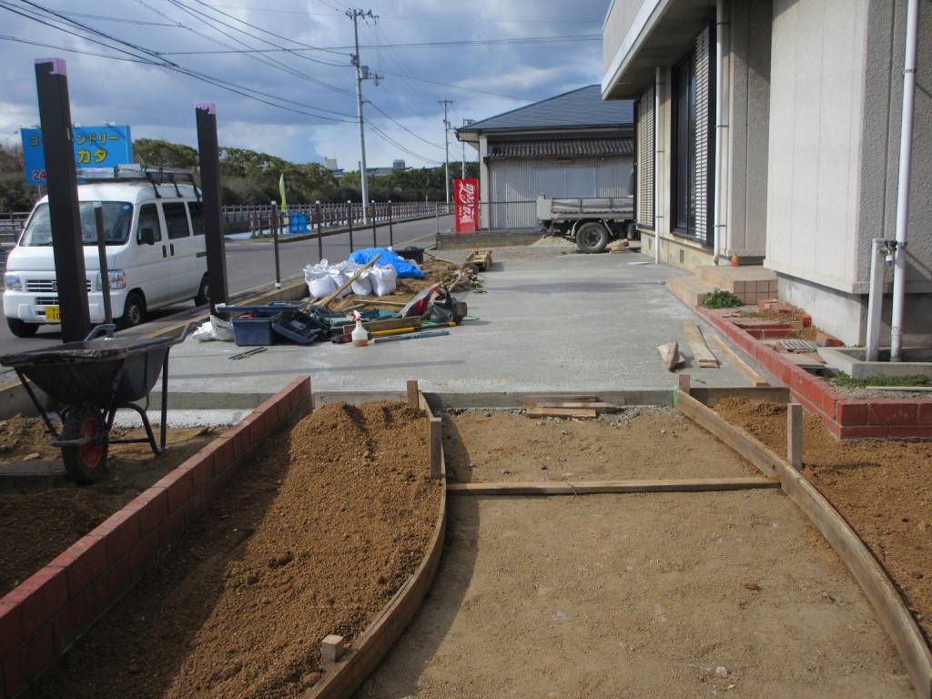 内部作業と併行して外構工事は土間打ちが済みサイクルポートの柱立て等が進んでます。