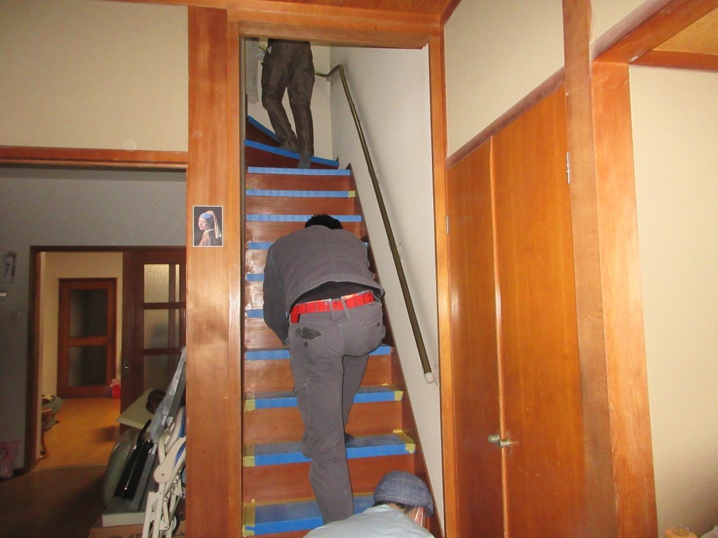 玄関廻りの養生が終りまして今回は2階4部屋の改修であり2階階段ステップの養生を入念に行ってます。