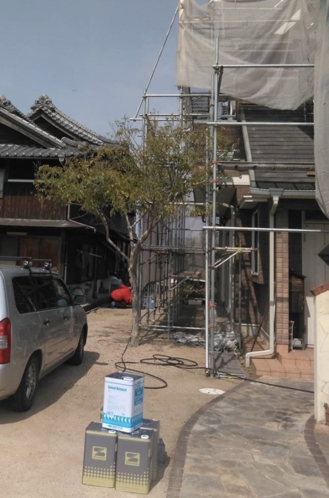 本日、外壁塗装工事が開始となり職人さんは塗料等が持ち込みされました。