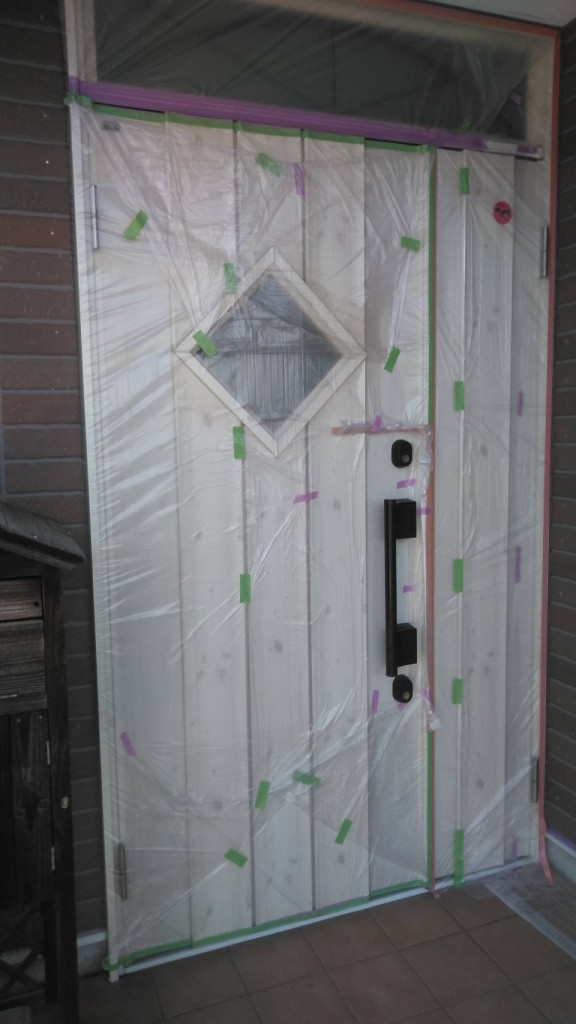 外壁塗装工事に当たり玄関ドアの養生を入念に行いました。