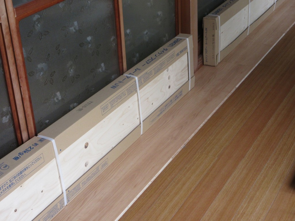 2階床張り作業が済みまして1階広縁、玄関廻りのフロア床重ね貼り作業に移ってます。
