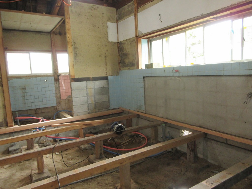 ダイニング、キッチンと浴室、洗面室の壁の解体終了です。また、床の根太、束の補強中です。