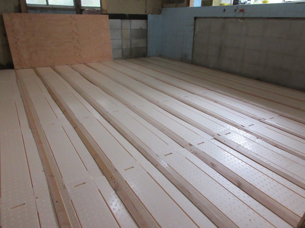 本日、ダイニング・キッチンの床解体しまして根太補強をいれ上に断熱材を全面に敷きました。