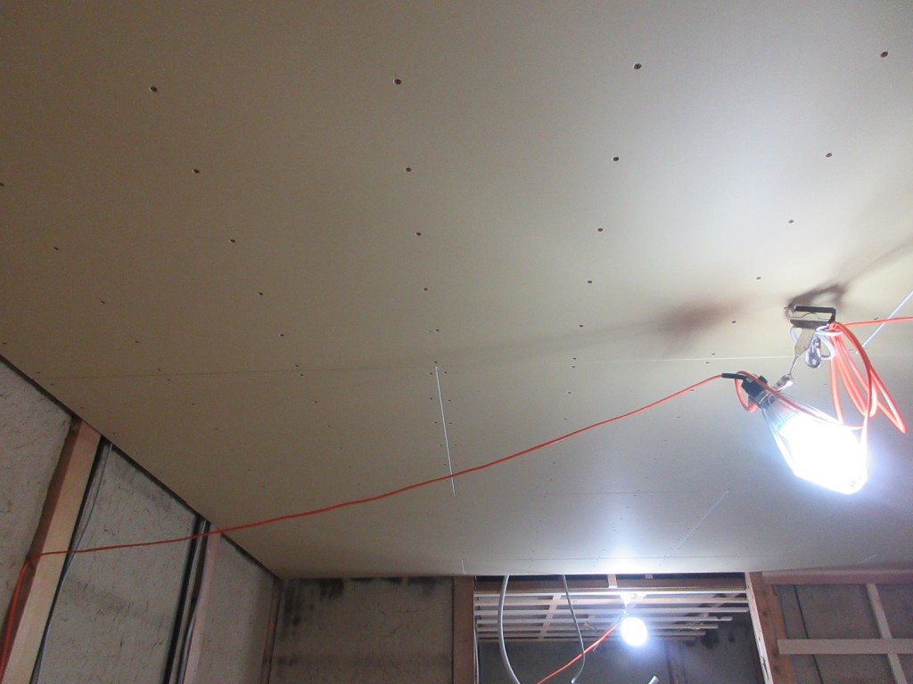 大工工事は予定以上に進みましてダイニング・キッチン天井の不燃ボード張りが終了しました。