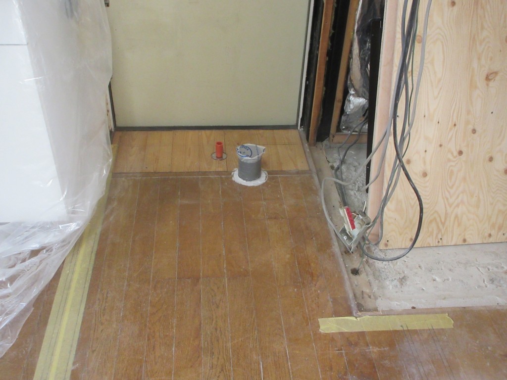 本日も既存クロス剝がしは2階終了しまして1階に移ってます。洗面所廻りの解体も済みましてリビングキッチンの床材下地の作業を行います。