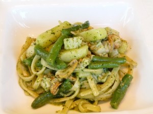 ホタテをオリーブオイルでいため、じやがいも・いんげん・パスタと絡めソース投入。