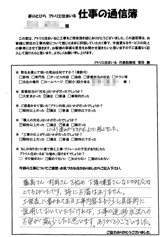 こまめに連絡を頂き、不安なく工事終了まで大変助かりました。